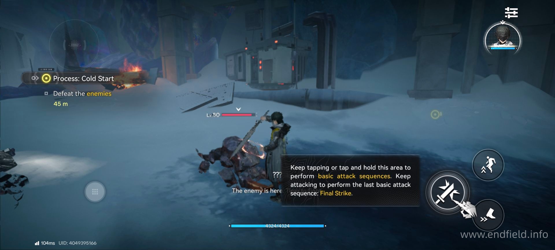 持续点击或长按攻击按钮可执行普通攻击连段。持续攻击可触发最后一段普通攻击:终结技。